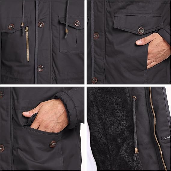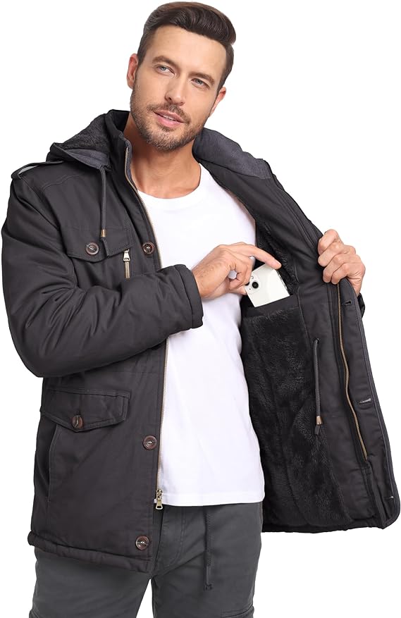Mens Winter Jackets with Removable Hood Fleece Lined Cotton Military Work Jackets Outerwear Coats with Pockets
